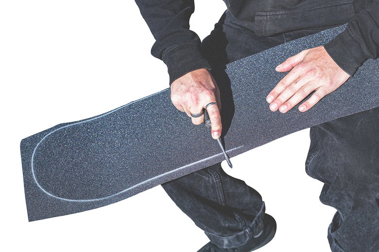 Step 5. Then you’ll grab a razor blade and cut from the bottom of the griptape on the edge of the deck, so you poke a little hole through. Firmly hold the razor against the board at about a 45 degree angle and start slowly cutting the griptape inward so you outline the deck. Take your time and cut until the excess griptape is off the skateboard.